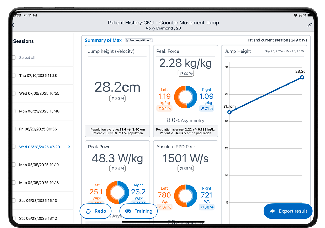 • Measures jump height, velocity, ground reaction force (GRF), and power, offering insights into athletic explosiveness and movement efficiency